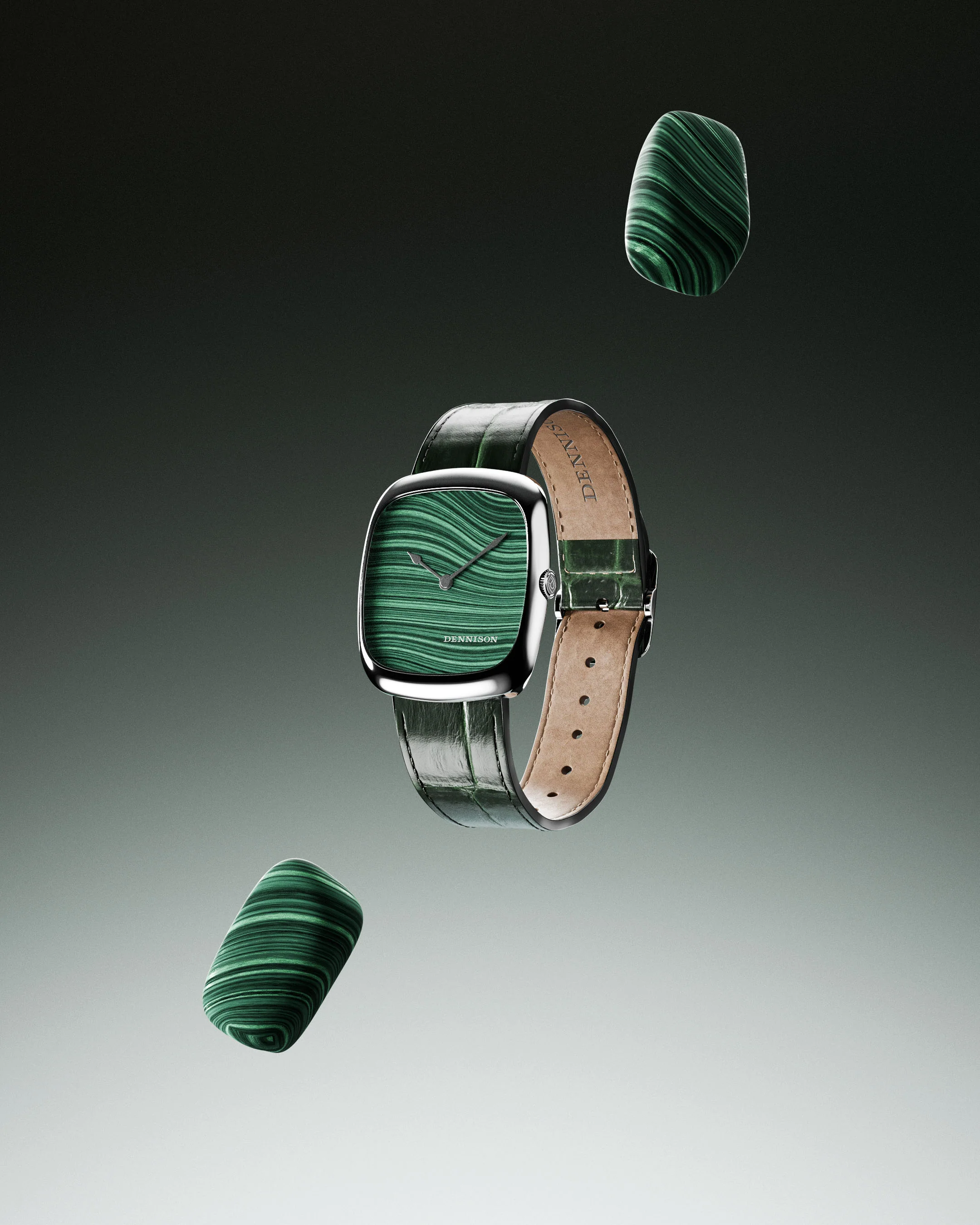 A distinguished revival of the classic Dennison cushion case, the ALD Collection channels the timeless refinement and flair of the 1960s. The dial features Natural Malachite, a vibrant green stone known for its rich bands and tonal depth, each one expertly cut and polished to reveal its unique character. Available in stainless steel, the case measures 37mm by 33.5mm, and 6mm thickness. Complemented by an embossed green leather strap with a bespoke pin-buckle that reflects the elegant curvature and finish of the case. A testament to enduring style and subtle detail. Additional colour straps can be added to your order.