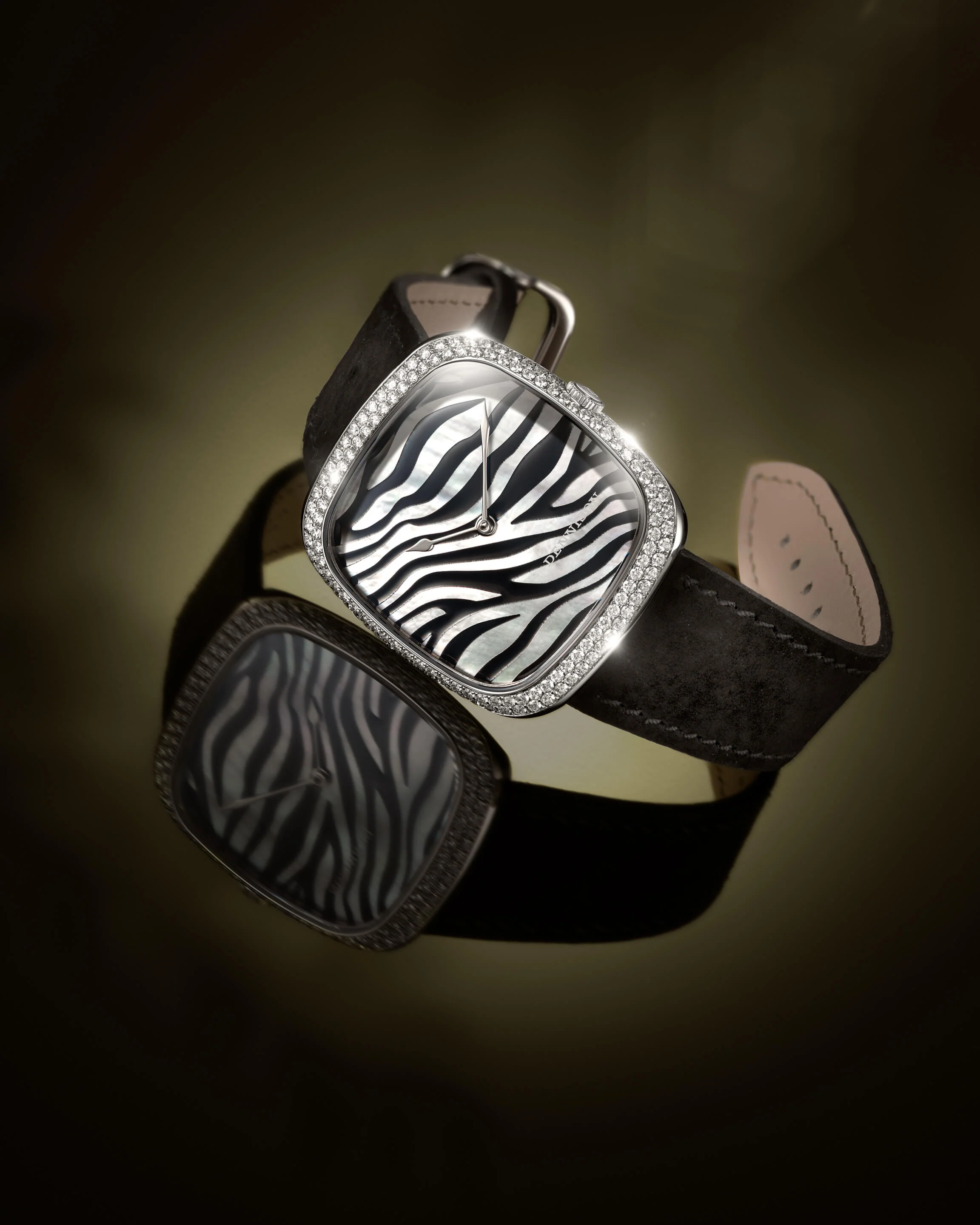 The Dennison Safari Capsule captures the spirit of the wild through an iridescent backdrop of mother-of-pearl dials with hand-inlaid black enamel striping. This unique design by Emmanuel Gueit, gives an untamed sense of movement, bringing a safari icon to life.Exclusively available as part of Dennison’s ALD Diamonds Collection, the two-row natural diamond set case introduces an unexpected dimension. The animal motifs transcend reference and enter the realm of modern glamour.