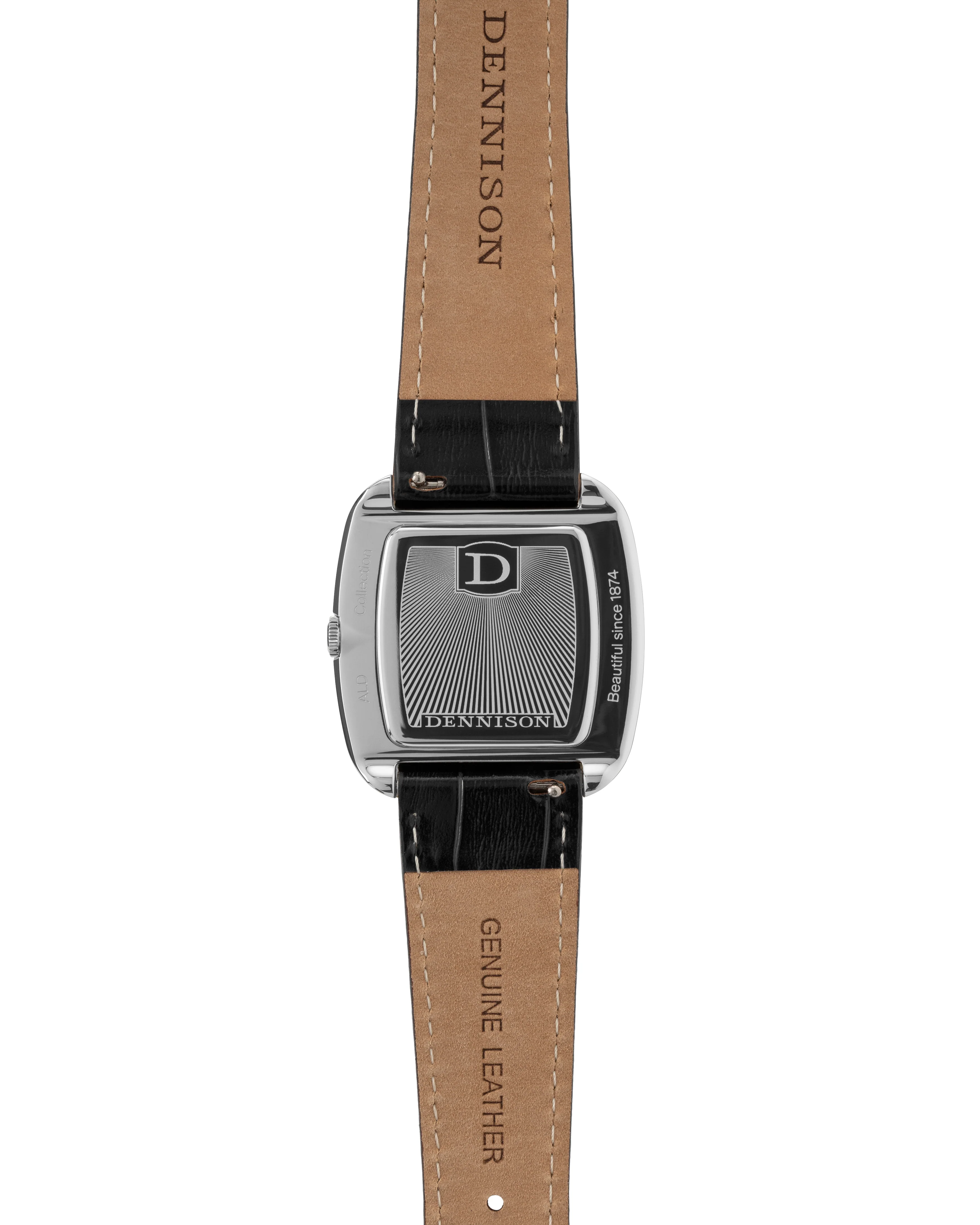 A distinguished revival of the classic Dennison cushion case, the ALD Collection channels the refined aesthetics and flair of the 1960s. The dial features a black Sunray finish which catches the light to reveal a fine radial brushing. Blending vintage flair and contemporary style for a timeless statement. Available in stainless steel, the case measures 37mm by 33.5mm, and 6mm thickness. Complemented by a black embossed leather strap with bespoke pin-buckle that reflects the elegant curvature and finish of the case. Additional colour straps can be added to your order.